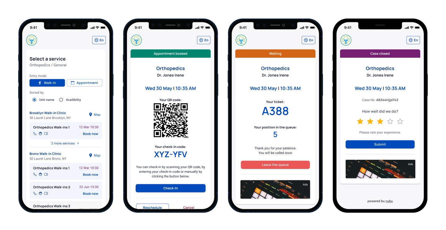 The mobile portal guides the user through the entire journey, starting from finding a specialist and booking an appointment to the moment they enter the doctor’s office. And even beyond that — after the appointment, the user is prompted to rate the quality of the service.