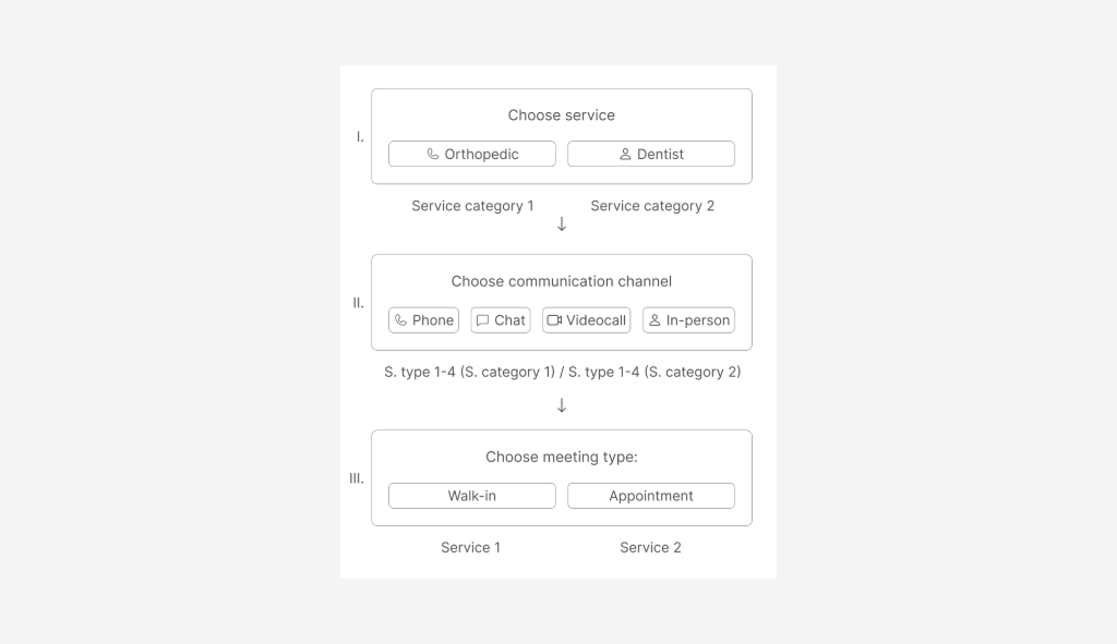 When the option of abandoning the feature concept was already being discussed, I proposed trying an unexpected move – to be more flexible and use the system’s structure in an unconventional way. As mentioned earlier, the service selection cannot be divided into 2 stages (I and III, see image 1), since the type of appointment (walk-in or booked) is a parameter of the service itself. However, we can use the Service Category to mimic this division. The resulting scheme is as follows: we create 2 Service Categories – in order to allow two types of meetings for one service (e.g., “Sales Walk-In” and “Sales by Appointment”). Each Service Category should contain 4 Service Types for each communication channel. Thus, after choosing a Service Category, the user selects the desired communication channel (represented by Service Types), and finally, the type of meeting using the Walk-In and Appointment buttons, which technically are two different services under one Service Category: