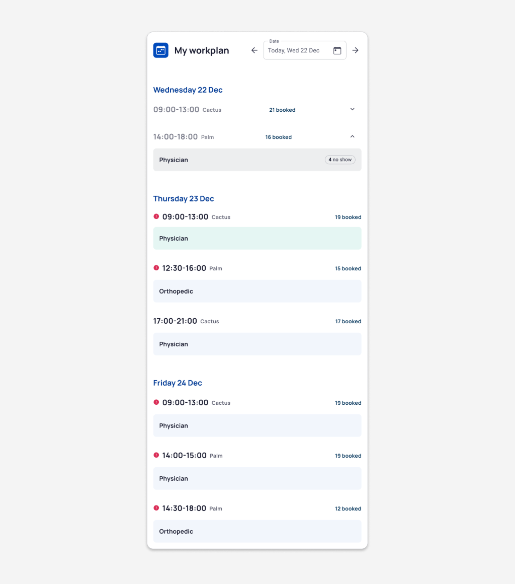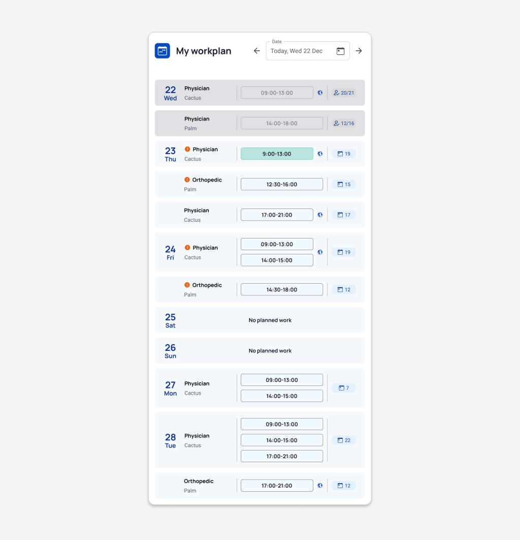 — Shifts of the same service for each unit are shown in separate containers with the date only in the top one, which visually is better than having the date as a headline above and unifies visually containers related to the same date.