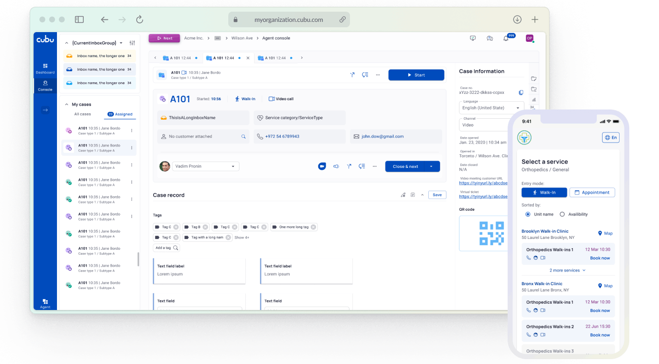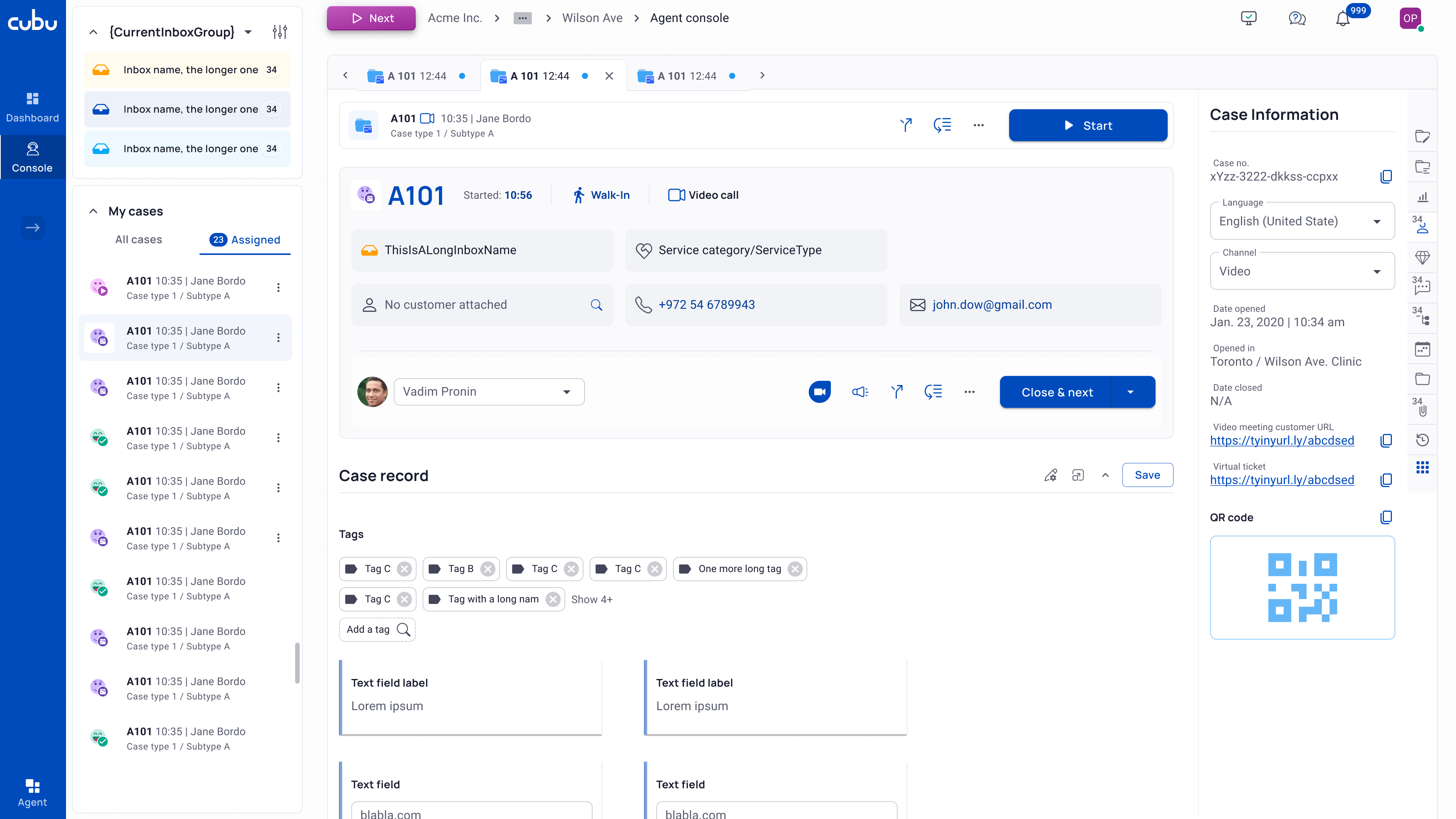Case Tab is the main screen used by agents. On the left, there is a list of inboxes and cases associated with the agent. The central part displays essential information about the case, its content and tools for working with it. On the right, there’s a tab bar with various tabs that are customized according to the organization’s needs.