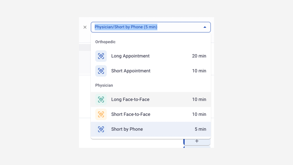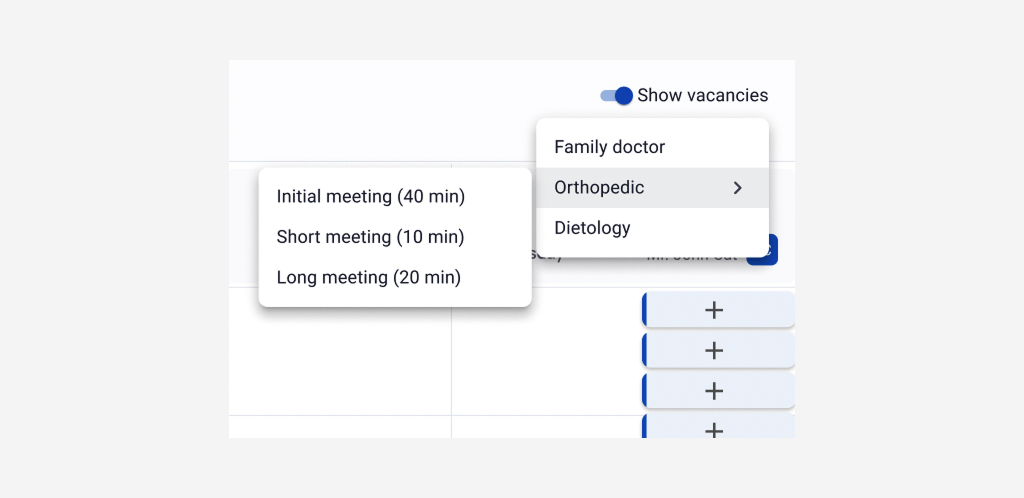 One of the tasks I worked on was optimizing the transition of the calendar into booking mode. The issue was that in any specialist’s calendar, even if they offer just one service, there are likely to be multiple versions of this service (Service Type) for meetings of different durations. For this reason, it’s necessary to display slots according to their duration. The previous solution involved a toggle switch activating a two-level dropdown for sequential selection of the service and the type of meeting. The main problem here was the position of the dropdown, which was almost flush with the right side of the screen, causing the second level to open to the left, contrary to the direction indicated by the arrow and the general reading direction. According to the testing team reports, this solution was not only ergonomically inefficient (requiring moving the cursor to the other side of the screen) but also made use particularly cumbersome if the service name was long.