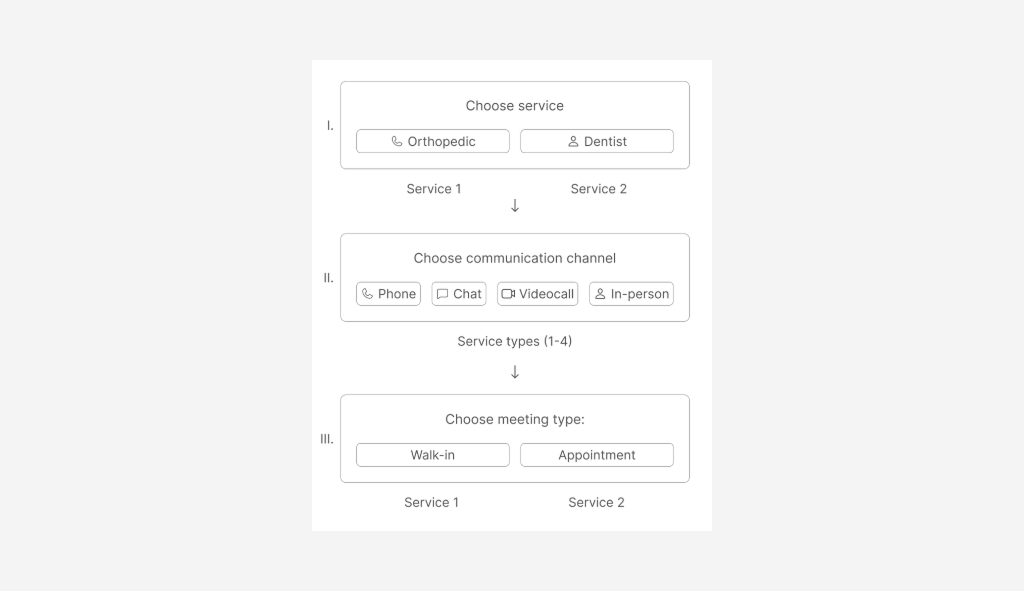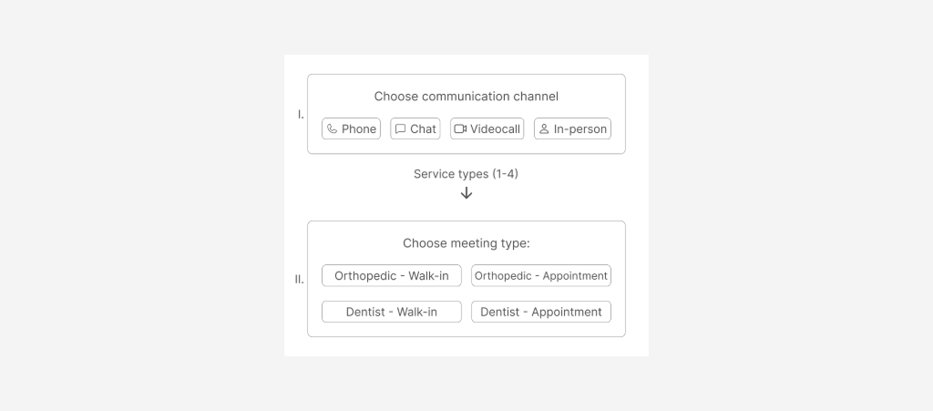 Clearly, such a structure not only fails to meet the initial concept, where the communication channel is selected following the service, but it also constitutes poor UX: users are forced to understand that for each service, there are two buttons depending on the type of meeting (Walk-In/Appointment). This setup already looks inconvenient when there are only two services, but if there are 3 or 4 services, users would have to choose from 6 or 8 buttons, all displayed at once.