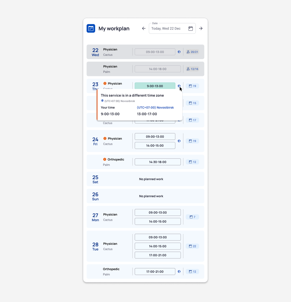 Early users and QA team reported several inconveniences of the widget: it showed only three upcoming days, space was used inefficiently, there was no indication for shifts in different time zones, and to view the attendance statistics of a completed shift, it was necessary to expand an accordion.